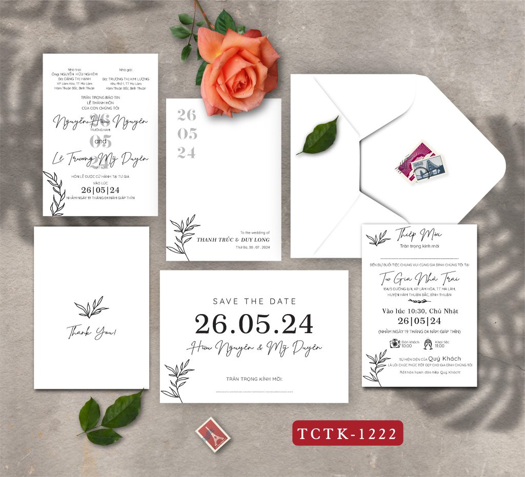 Mẫu thiệp cưới thiết kế đẹp màu trắng, họa tiết hoa lá tông màu trắng đen