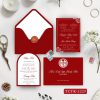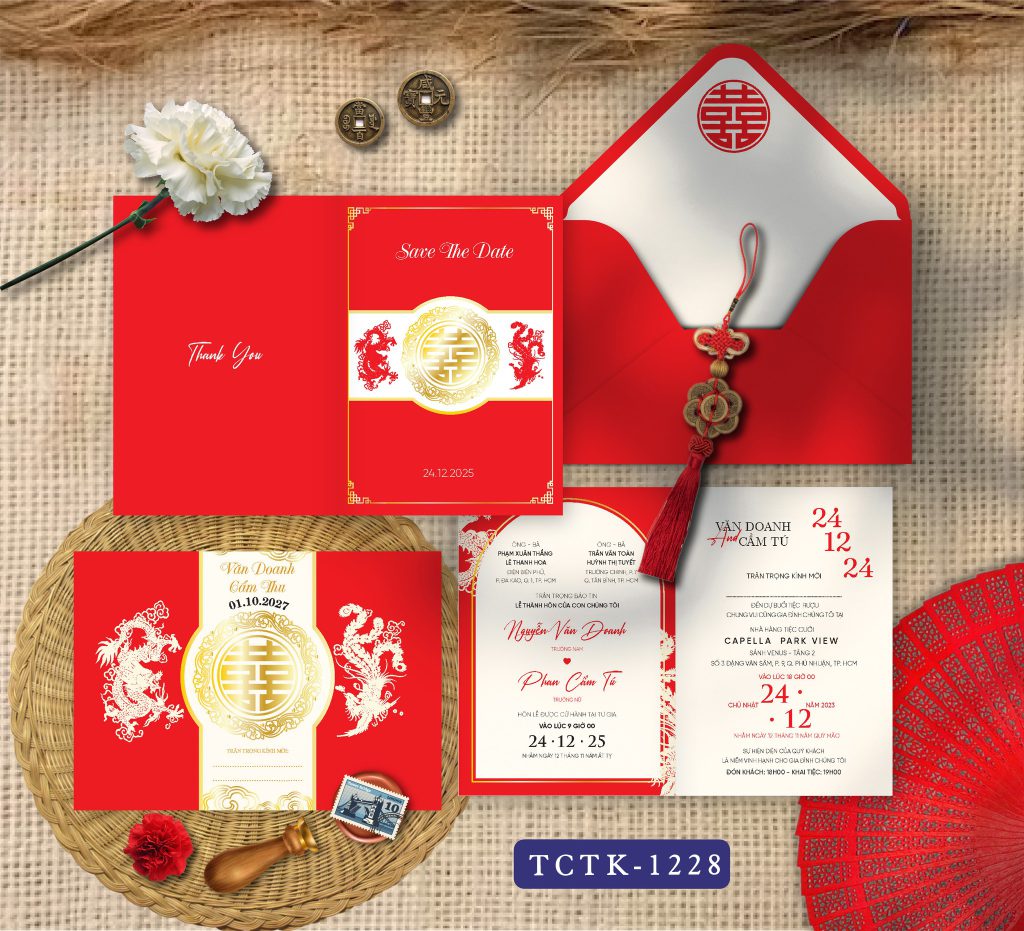 Mẫu thiệp cưới thiết kế đẹp màu đỏ đô, họa tiết rồng phụng song hỷ