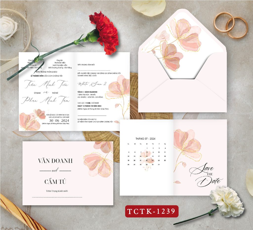 Mẫu thiệp cưới thiết kế đẹp màu hồng phấn hoa màu nước