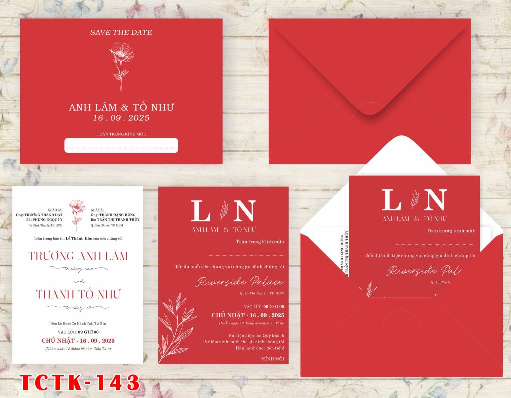 Mẫu thiệp cưới thiết kế phối đỏ hoa line trắng tinh tế