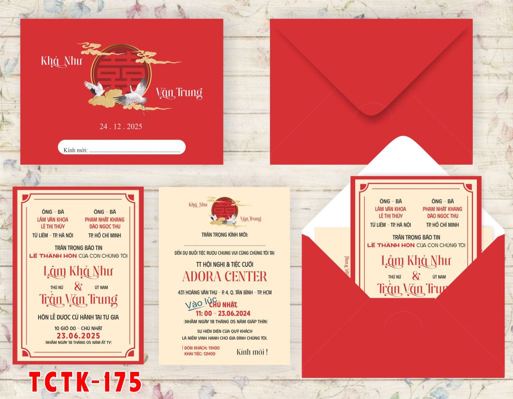 Mẫu thiệp cưới thiết kế kiểu ngang nắp chéo màu Đỏ đậm song hỷ chim hạc